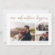 A modern and exciting save the date card for the adventure-minded couple, this clean and simple design features three horizontal or landscape orientated photos in a grid collage layout, with "our adventure begins" above in hand lettered script. Personalise with your announcement, names, and additional details along the bottom, and add more (like your wedding website) to the back.
