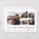 A modern and exciting save the date card for the adventure-minded couple, this clean and simple design features five square photos in a grid collage layout, with "our adventure begins" above in earth tone terracotta rust hand lettered script. Personalise with your announcement, names, and additional details along the bottom, and add more (like your wedding website) to the back.