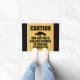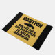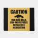 A silhouette of a handgun and the phrase "Caution, our dog has a gun and refuses to take his medication"