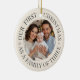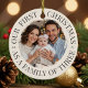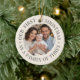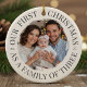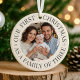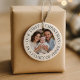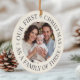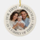 Modern white round ceramic ornament with arched OUR FIRST CHRISTMAS and curved AS A FAMILY OF THREE typography. A soft brush-stroke circle frames your family photo, and the split year sits neatly at the sides. Clean, timeless, and perfect for marking the first holiday with baby.