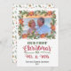 Christmas holiday photo card for newlyweds features your favourite horizontal wedding or honeymoon photo with "Our first Christmas as Mr. & Mrs." red and green typography lettering. Your photo is framed in Christmas pine boughs, poinsettias, pinecones holly and berries. Personalise with your names and the year beneath. Cards reverse to a background pattern of holiday pine boughs, dried orange slices, gift boxes, stars, pinecones and berries that coordinates with the frame on the front. All are done in watercolors.