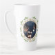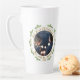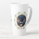 Our First Christmas as Mrs. & Mr. Script Wedding Photo Latte Mug. Modern holiday design for newlyweds with a photo in the circle frame, pine branches and text in a modern golden script Our first Christmas as Mrs. & Mr. quote and wedding year. Insert your photo into the template and personalise the names and year.