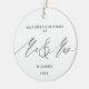 Our First Christmas Custom Minimalist Simple Modern Mr and Mrs Ceramic Ornament featuring elegant black calligraphy on white background on the front, and round photo of the couple on the back.