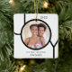 This modern Our First Christmas Engaged Photo Ornament is decorated with the word JOY in black on a white background.