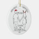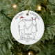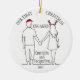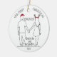 This line-art design features the backs of a couple as they walk away holding hands while in the Christmas spirit, sporting a Santa hat and a pair of antlers. Personalisation is for the names and a sweet note, or perhaps some details about your courtship on the back of the ornament. I love this simplistic, charming design with the pop of colour from the Santa hat and the antler headband. Great for a newly engaged couple or to give to your fiance or fiancee.