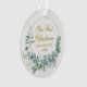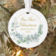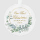 Modern Elegant Our First Christmas Watercolor Eucalyptus Leaves Greenery, Gold Circle Ornament - Gold Script, Photo Back