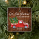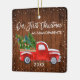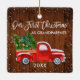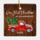 Modern Brush Script Our First Christmas as Grandparents Ornament includes Watercolor Vintage Red Truck with Christmas Trees, Lights, Snow and Christmas Presents. Rustic Country Wood Print. Snow Border.