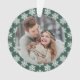 This modern holiday keepsake ornament features a photo of the newlywed couple on the front framed by a dark green border colour with contrasting pattern of white winter snowflakes. The back of the design includes the same colour scheme with "Our First Christmas" wording and a custom monogram of their names and the year they were married.
