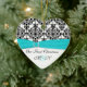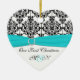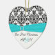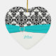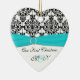 **PLEASE NOTE that the ribbon and jewels are works of art and are not real. This heart-shaped, ceramic ornament matches the Aqua, White, and Black Damask wedding collection shown below, and would make a nice keepsake of your special day.