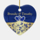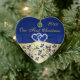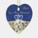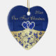 This royal blue and gold floral ceramic heart shaped ornament has a PRINTED blue ribbon and bow with a pair of FAUX glitter and diamond jewel PRINTED joined hearts on it. It would make a nice keepsake of your special day, or a great gift for the newlyweds, or change the text and give them as gifts to your wedding party attendants or special people as favours. If you need help customising this, or if you want something changed, email niteowlstudio@gmail.com.