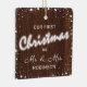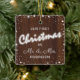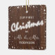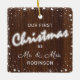 First christmas married tree ornament featuring a rustic wood background, snowflakes, a photo collage of the newlyweds, and a simple mr & mrs text template for you to customise.