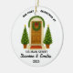 A personalized keepsake ornament celebrating a couple's first Christmas in their new home. Features a charming front door illustration and custom details like address, names, and year.
