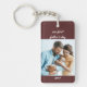 Photo keychain for a new daddy's first father's day. The photo template is set up for you to add 2 of your favourite pictures, which are printed one on each side, in square / instagram format. The wording is fully editable and currently reads "our first father's day [year] i love you daddy [name]". It has a simple, modern colour palette of dark red brown and white with bold, retro script typography.