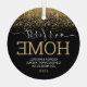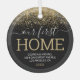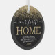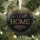 New home glass christmas ornament featuring a trendy black background, a elegant gold glitter waterfall design, the cute saying 'our first home', your name(s), your new address, and the year.