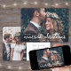 Send joyful holiday wishes as a new Mr. & Mrs! Celebrate marriage as newlyweds and share two of your favourite wedding pictures with a stylish custom photo "Our First Married Christmas" holiday card. All text on this template is simple to personalise to include any wording, such as Merry and Married, Merrily Married, Happy Holidays, Seasons Greetings, New Year Cheers etc. Modify or delete message on back to use as wedding thank you and Christmas card combined. (IMAGE PLACEMENT TIP: An easy way to centre a picture exactly how you want is to crop it before uploading to the Zazzle website.) The modern minimalist black and white design features trendy handwritten style script typography overlay and 2 photos of your choice. Family and friends will love displaying this elegant customised card. Cheers to merrily ever after!