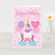 An adorable unicorn sitting on a rainbow surrounded by balloons and confetti. The top of the card has the hand lettered words 'Happy Birthday' while the heart shaped balloon has the hand lettered words 'nine today'. The perfect card for your sweet granddaughter's 9th birthday from 'plural' you!