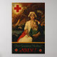A World War I poster showing a Red Cross nurse holding a young girl, with four horsemen representing war behind. Created by Cornelius Hicks.