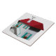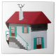 A hand painted image of a stereotypical French house, with a red tiled roof and blue window shutters.
