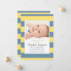 Announce the arrival of your baby boy in style with classic and simple birth announcement cards that feature a photo of your baby framed by preppy horizontal stripes and a little bow tie design accent. Slate blue, sunshine yellow, charcoal grey, and white colours.