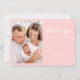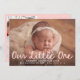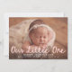 Welcome your newest arrival with this sweet and modern baby photo birth announcement featuring “Our Little One” in soft pink handwritten script. Your baby's horizontal photo is the focal point of the front, with their name and birth details elegantly displayed in clean white text below. The back of the card includes a vertical photo and a customisable thank you message, allowing you to share your joy and gratitude with loved ones. A perfect keepsake for baby girls and a beautiful way to celebrate this precious moment.