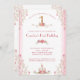 Magical fairytale invitation featuring a delicate floral in pink and green, with gold number 1 and a little princess swan at the bottom. The back of the invitation has matching floral design. Design©Rosalind Moore, Cherry Lane Designs.
