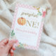 Our little pumpkin birthday invite with watercolor pumpkin, pink flowers and pastel pink plaid and gold glitter text.