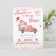 Our Sweetheart is a customisable Turning One invitation with a heart background, a red farm truck with pink balloons, and red and pink text.