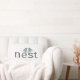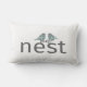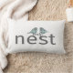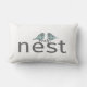 Simple grey typography with "Our Nest" on white lumbar pillow with two patterned birds. Sold here in white but the background colour can be changed to match your decor and style. Design by SimpleLiving.