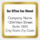 This business sticker has a text template you can edit to show a custom message. There are five lines of display text that you can edit. As shown, the top line reads Our Office Has Moved. The font on the top line has a bold typeface. The second line is for the business name. The third line is for the street address. The fourth line is for the suite number. (If there's no suite number, you can make this the line for the city, state and zip. Then delete the final line.) The final line is for the city, state, and zip code.