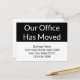 Our Office Has Moved is in white text at the top. The bottom has black display text you can edit to show your company's name, new address, and phone number. All text can be edited or deleted.