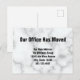 Display text says ' Our office has moved'. You can personalise your postcard with your company's name, new address, and phone number. The background has a faux white marble look.