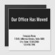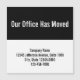 "Our Office Has Moved" is in large, white text at the top. Four lines of black display text are at the bottom. You can edit the text to show your company name, address, and phone number.