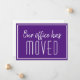 We have a new address moving postcards for a modern business or chic corporation looking to update their clients on a new location. Our office has moved. Classy, minimalist typography on purple cards with white typography for your company. Customise the change of address on the back.