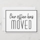We have a new address moving announcement card for a modern business or chic corporation looking to update their clients on a new location. Our office has moved. Classy, minimalist typography on sleek black and white cards for your company. Customise the change of address on the back.