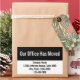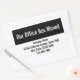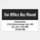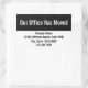 The top portion of this moving announcement sticker is black. Its white display text reads: Our office has moved. At the bottom, there's black display text for your company name, address, and phone number.