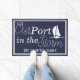 Nautical navy blue doormat featuring the phrase "Our Port in the Storm" in white lettering including your personalised family name. Get classic coastal elegance with this great nautical doormat.