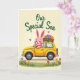 This card shows a cheerful bunny 🐰 sitting in the driver’s seat of a bright yellow, vintage-style compact car, smiling with rosy cheeks and long pink ears tilted as if enjoying the ride. The car sits across the lower middle of the scene on a pale cream background, with rounded details that give it a cozy, friendly look. On top, a wooden roof rack carries a full bundle of flowers in purple, orange, and teal, like a sweet surprise being delivered. A strip of green grass runs along the bottom edge, dotted with small blossoms that echo the colors above and add a gentle garden setting 🌷. Near the bunny, tiny red hearts float in the air, hinting at affectionate pride and a close family bond. Centered above the illustration, the words “Our Special Son” appear in flowing green lettering that stands out clearly against the light background. The yellow car has softly shaded curves, dark wheels, and a simple window shape framing the bunny’s bright, open grin.
