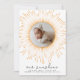 This cute photo birth announcement/baby shower thank you card features an orange sunburst wreath around the round photo of your baby. It is gender-neutral- perfect for a baby boy and a baby girl! Below is an 'our sunshine' header in elegant handwritten script calligraphy. The baby´s name and information are in a smaller, simple font. The reverse of the card features a custom message and a ´´thank you´´ header. To customise, click on the ´´Personalise´´ button and change the template text and photo to your own.