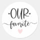 Our Favourite Favour Sticker with modern calligraphy for Wedding Welcome Bag. Design features a modern style script text layout. To make advanced changes, please select "Click to customise further" option under Personalise this template.