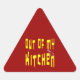 Out of my Kitchen saying for cooks with an attitude, moms with Momitude and those slaving over a hot stove everywhere. Fun food slogan in blood red scratchy letters with a meat cleaver in the 'N'