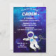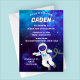 Make your child’s celebration truly out of this world with this vibrant space-themed birthday invitation! The design features a deep blue-purple galaxy background filled with stars, giving the perfect cosmic atmosphere for any little astronaut. A cheerful cartoon astronaut floats weightlessly near the bottom, adding a playful and adventurous touch kids love.