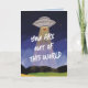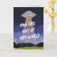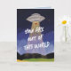 Painted UAP spaceship in a light beam and heart on a dark night sky background with the phrase "You are out of this world".