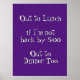 A fun and whimsical out to lunch joke that says: Out to Lunch if I'm not back by 5:00 Out to Dinner Too in a fun white font with a black drop shadow to give it depth. On a bold purple background. All elements can be customised to fit your needs. Hate purple? no problem, change it! #officehumor #outtolunch