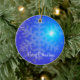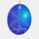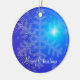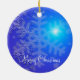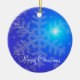 Outdoor Christmas ornaments with picture of snowflakes on blue background and customisable text.