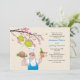A cute invitation for an outdoor dinner party featuring a blooming tree branch with paper lanterns and a chef holding trays of food and drinks.