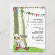 A delightful outdoors design for a casual "open air" rehearsal dinner party. The card features trees strung with colourful flags and a cook serving the "rehearsal dinner" on a tray. It's whimsical and fun!