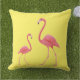 Outdoor throw pillow is shown in a solid colour of yellow with a cute flamingo print.