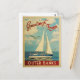 This Greetings From Outer Banks North Carolina vintage travel nautical design features a boat sailing on the water with seagulls and a blue sky filled with gorgeous puffy white clouds.
