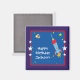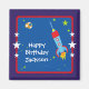 A cute Birthday design with a spaceship flying through the sky with a planet and stars. The picture is surrounded with a red border with three white stars on each side on a blue background. The text can be customised for your own special occasion.