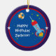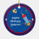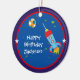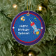 A cute Birthday ornament with a spaceship flying through the sky with a planet and stars. The picture is surrounded with a red border with one white star on each side on a blue background. The text can be customised for your own special occasion, with each side having different text.